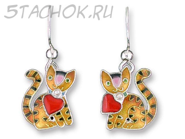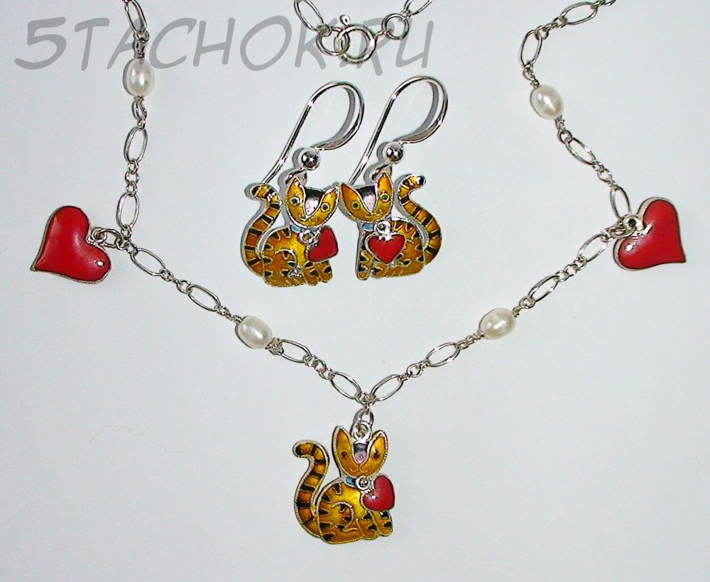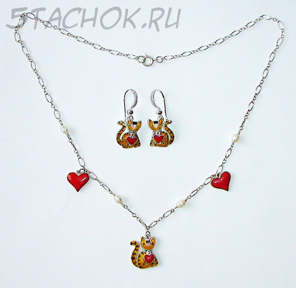 Набор Серьги и колье "Котики-валентинки" серебро 925, ювелирная эмаль, ювелирные камушки