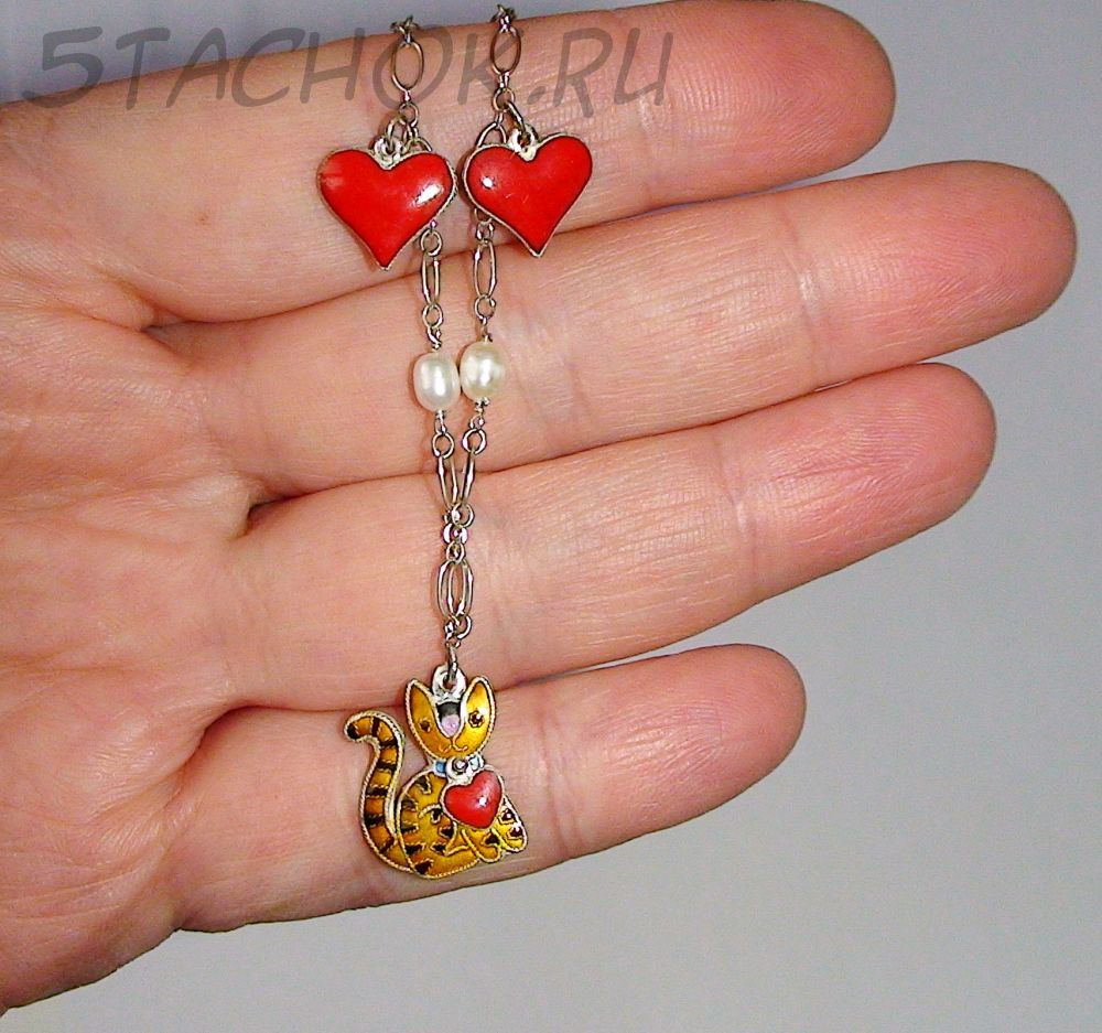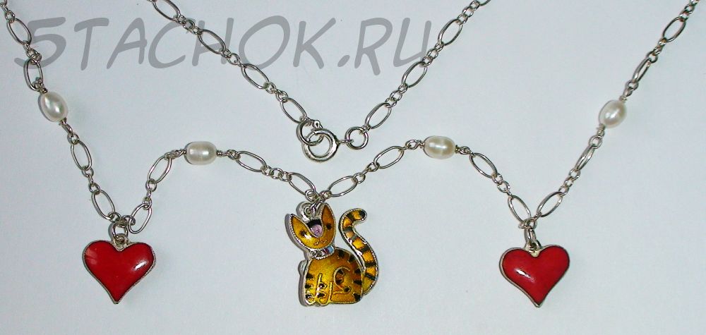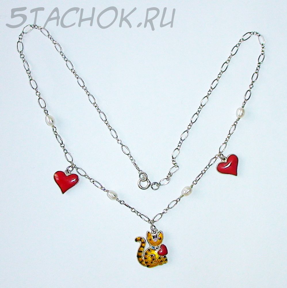 Кулончик - объемный двухсторонний котик. С одной стороны у него подвижная подвесочка в виде сердечка. На колье используются ювелирные камушки с перламутром под речной жемчуг.