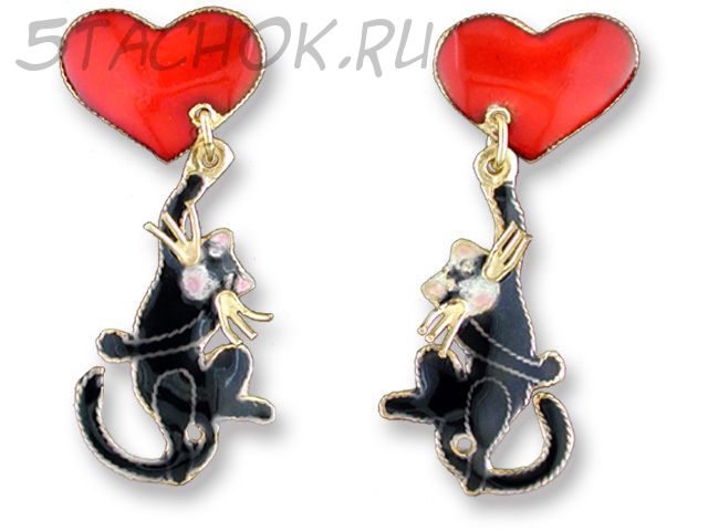 Серьги-гвоздики "Черный кот висит на сердечке" серебро 925, ювелирная эмаль
