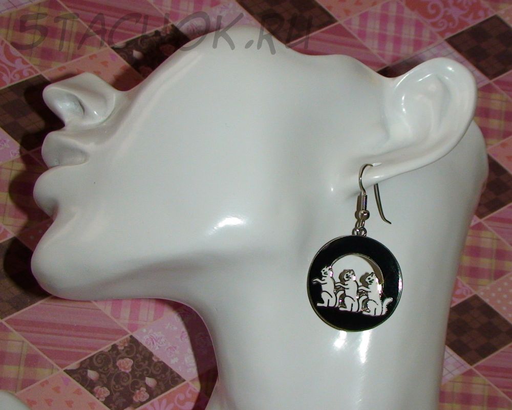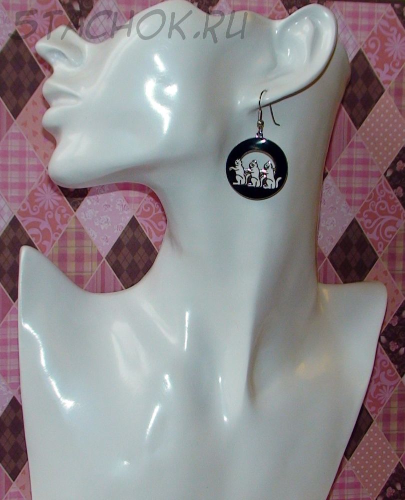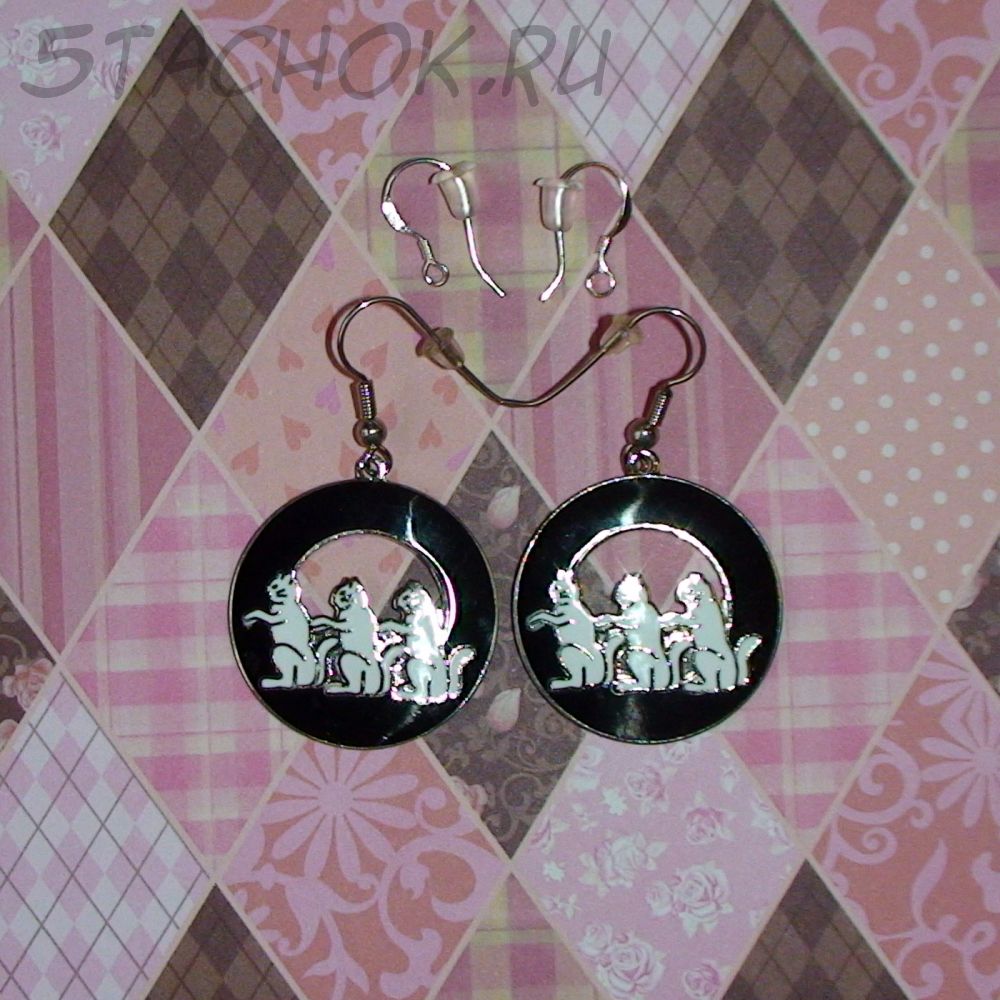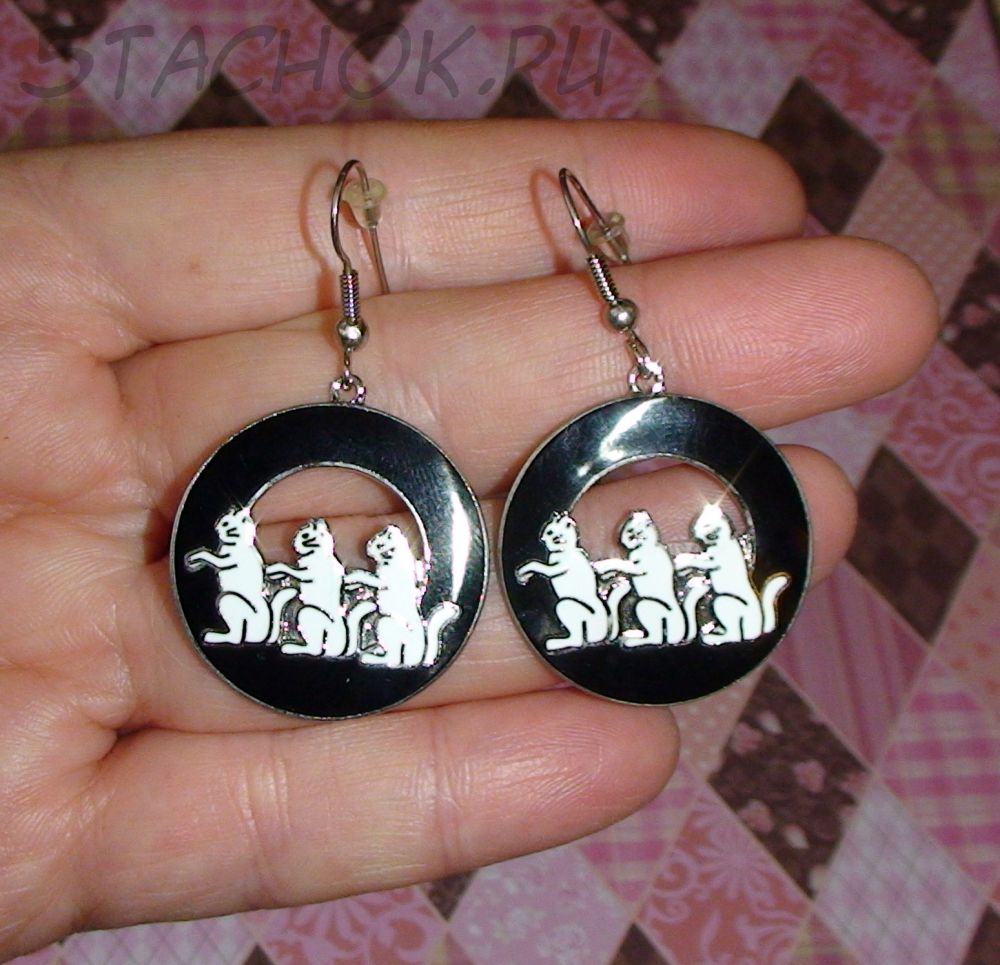 Серьги "Три белых котика" под серебро, ювелирная эмаль