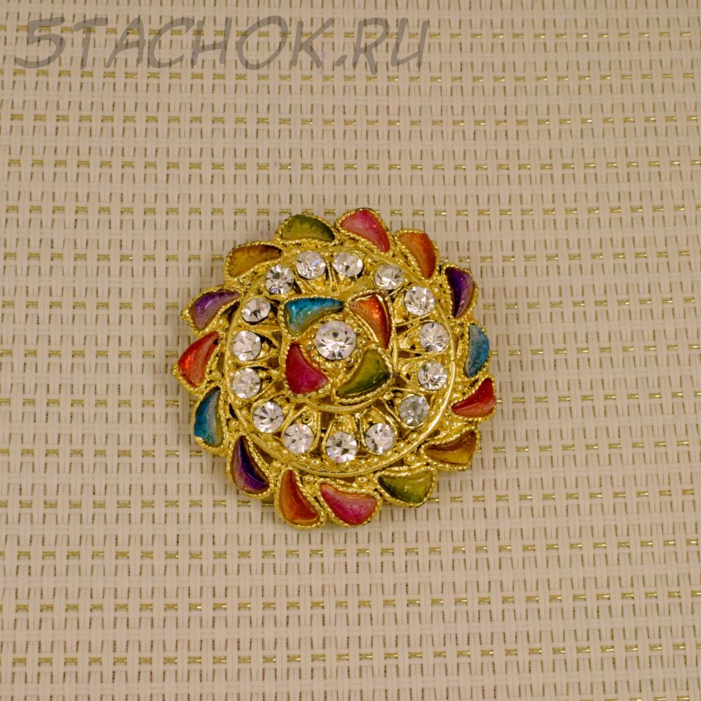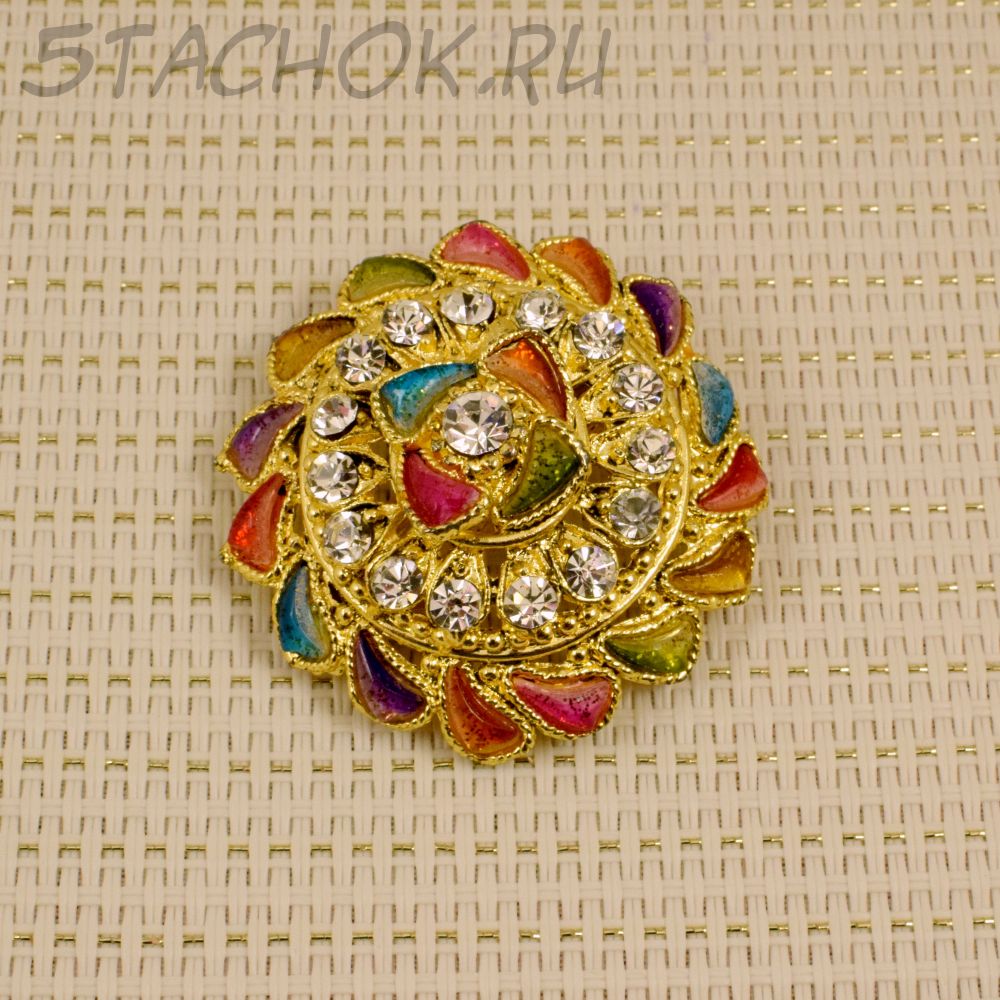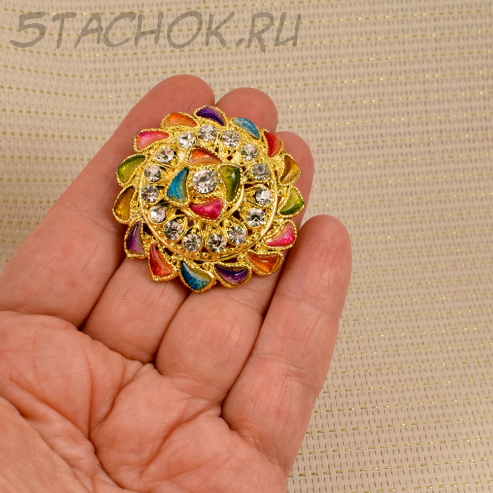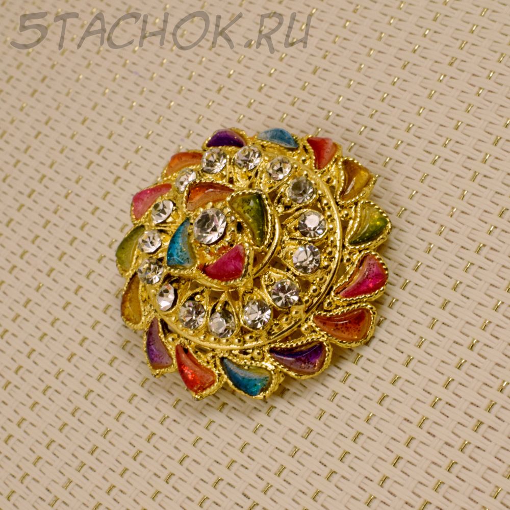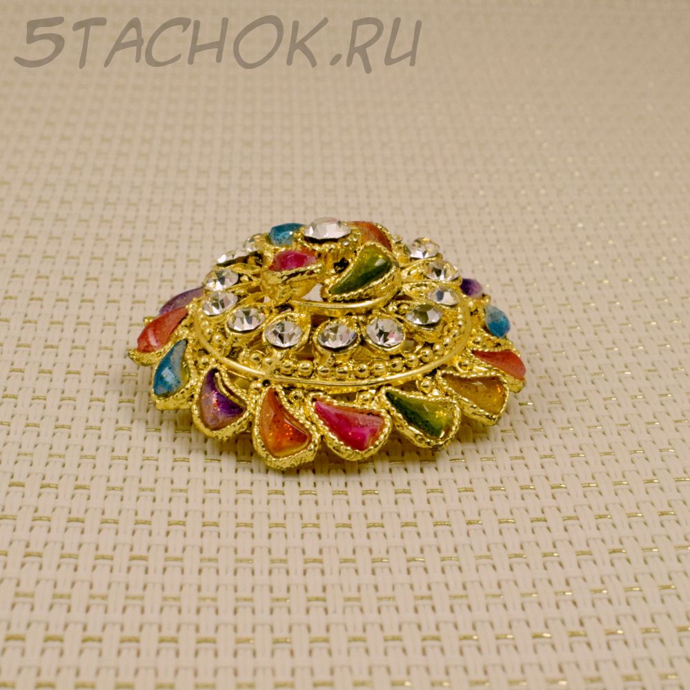 Выполнена в цвете блестящего золота с использованием разноцветной блестящей перламутровой эмали и крупных страз белого цвета.