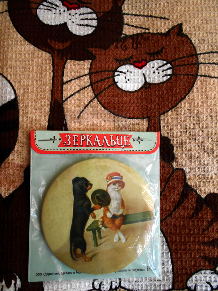 Симпатичное зеркальце с песиком и котиком. Корпус зеркальца из легкого металла.